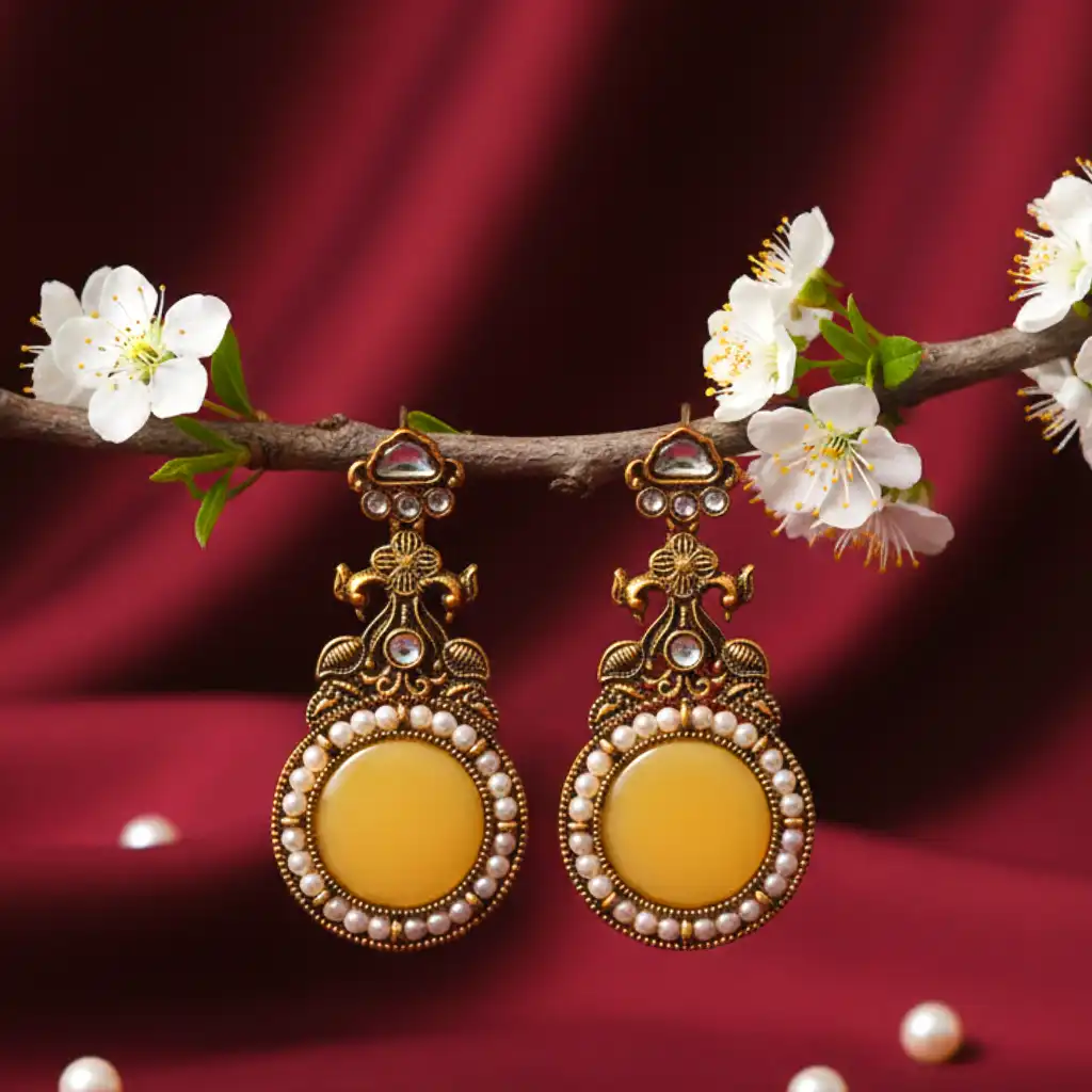 Grace aur royalty ka perfect blend – yeh stunning antique drop earrings traditional design ke saath modern elegance ko beautifully combine karte hain. Intricate detailing, floral inspired motifs aur center mein soft yellow stone inhe ek rich festive look dete hain. Surrounding pearl accents design ko aur bhi classy aur timeless bana dete hain. Perfect for weddings, festive occasions aur traditional celebrations.
