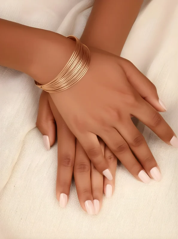 A sleek, wide gold cuff with fine silk textured lines ? minimal yet bold, perfect for adding polish to your look.
