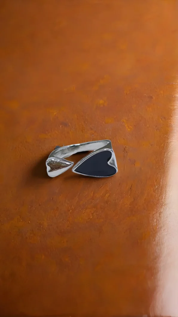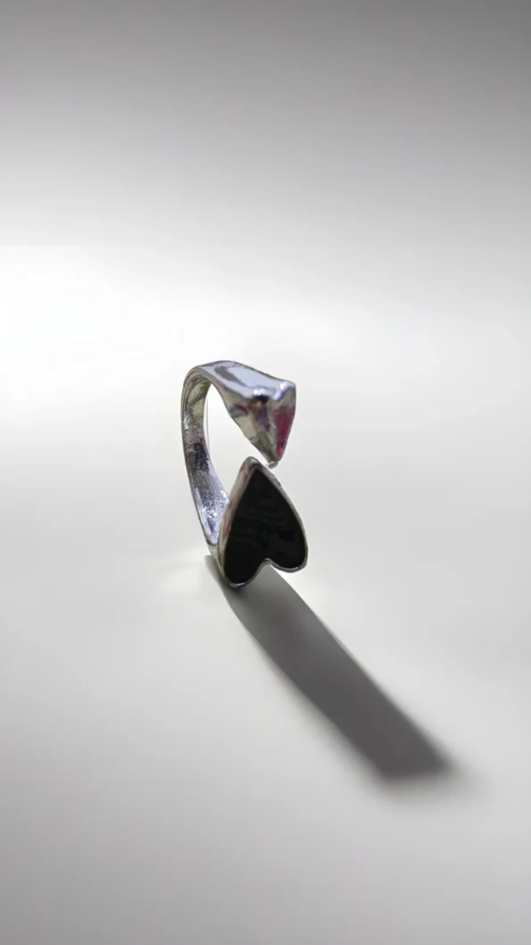 A cute silver heart-shaped ring with sleek black enamel purr-fect for lovers who adore minimalist charm.