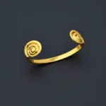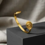 Turn heads with this sculptural open cuff designed with dual snail ends, inspired by fluid motion and contemporary art. The smooth, polished band gracefully wraps around the wrist, while the snail motifs add a bold, artistic dimension. Lightweight yet impactful, this piece blends minimalism with statement styling—perfect for those who love standout accessories without overdoing it.