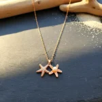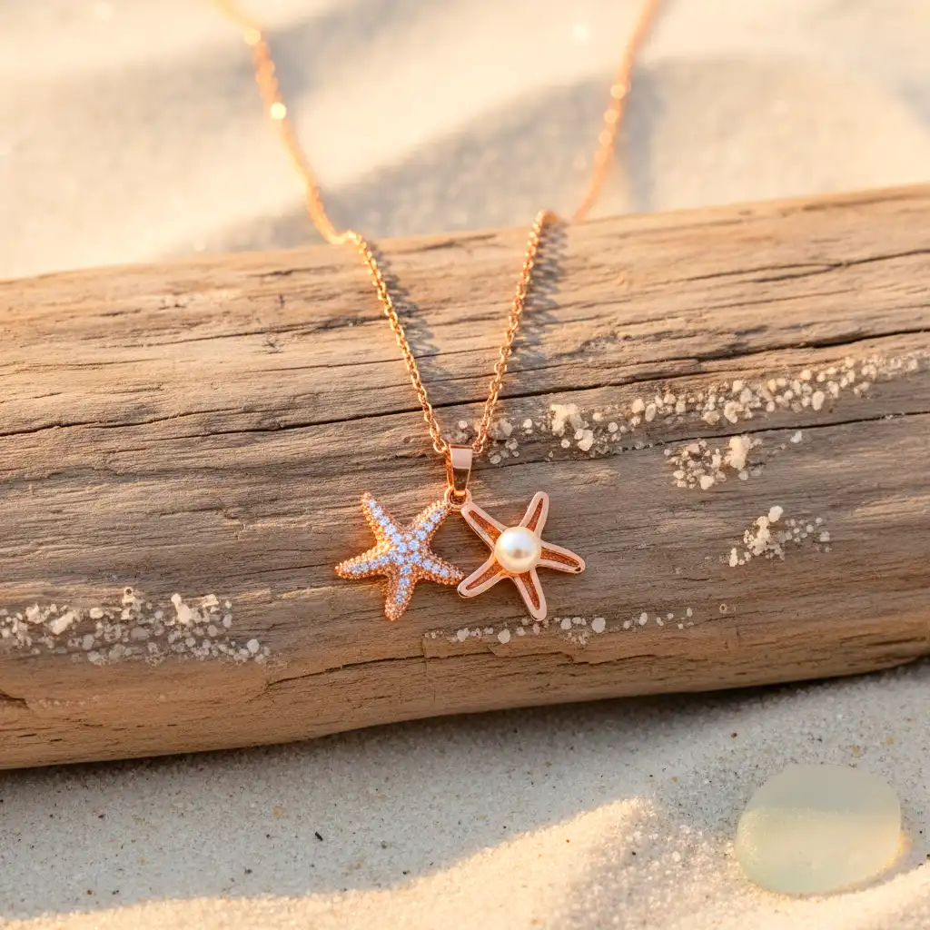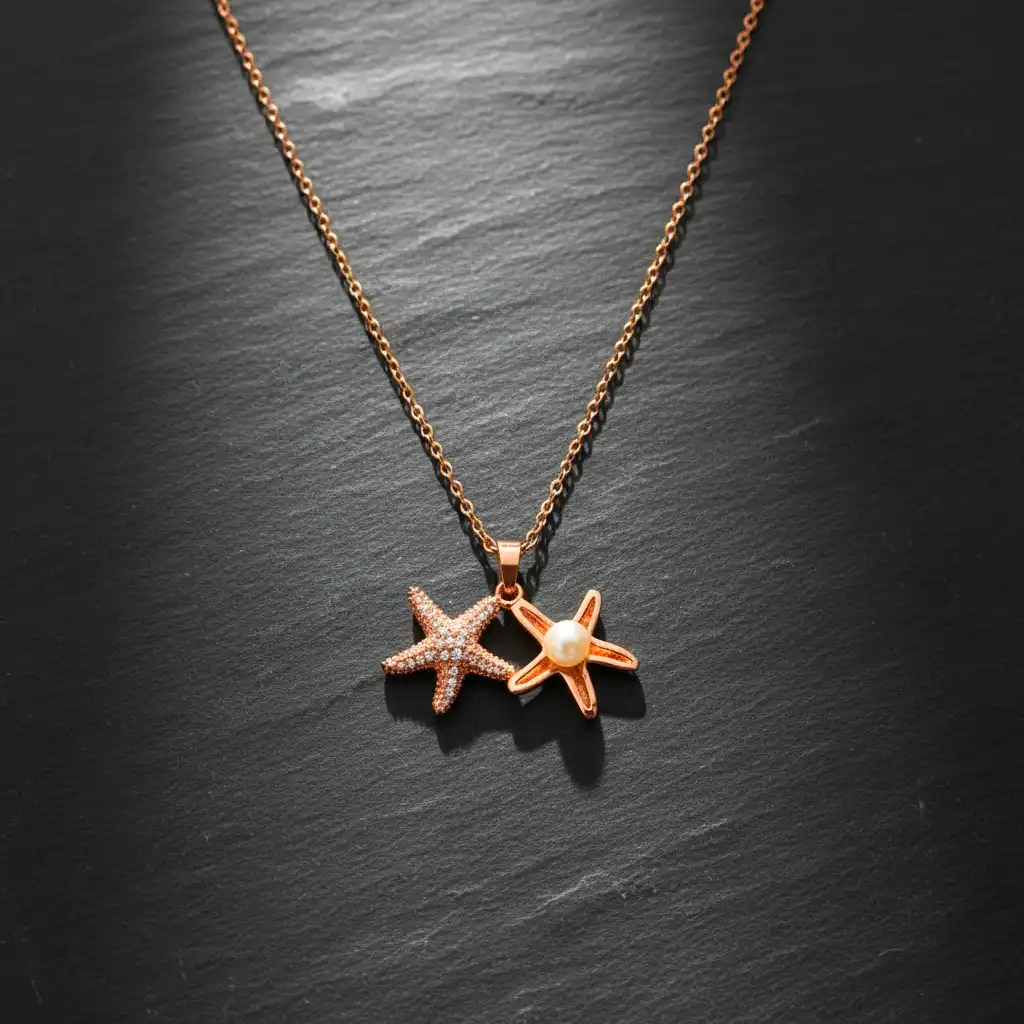 This necklace features two beautifully crafted starfish charms—one studded with fine detailing and the other centered with a soft pearl. The combination creates a balanced look of texture and elegance, giving the piece a fresh, coastal-inspired identity.