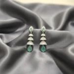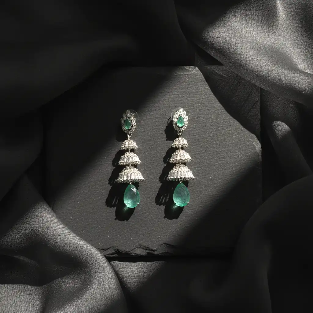 Starry Jhumki are a statement of elegance and grace. Designed in a layered chandelier silhouette, these earrings feature sparkling baguette-cut crystals arranged in cascading tiers. The highlight is the beautiful pear-shaped emerald green stone at the top and bottom, creating a balanced, luxurious look.