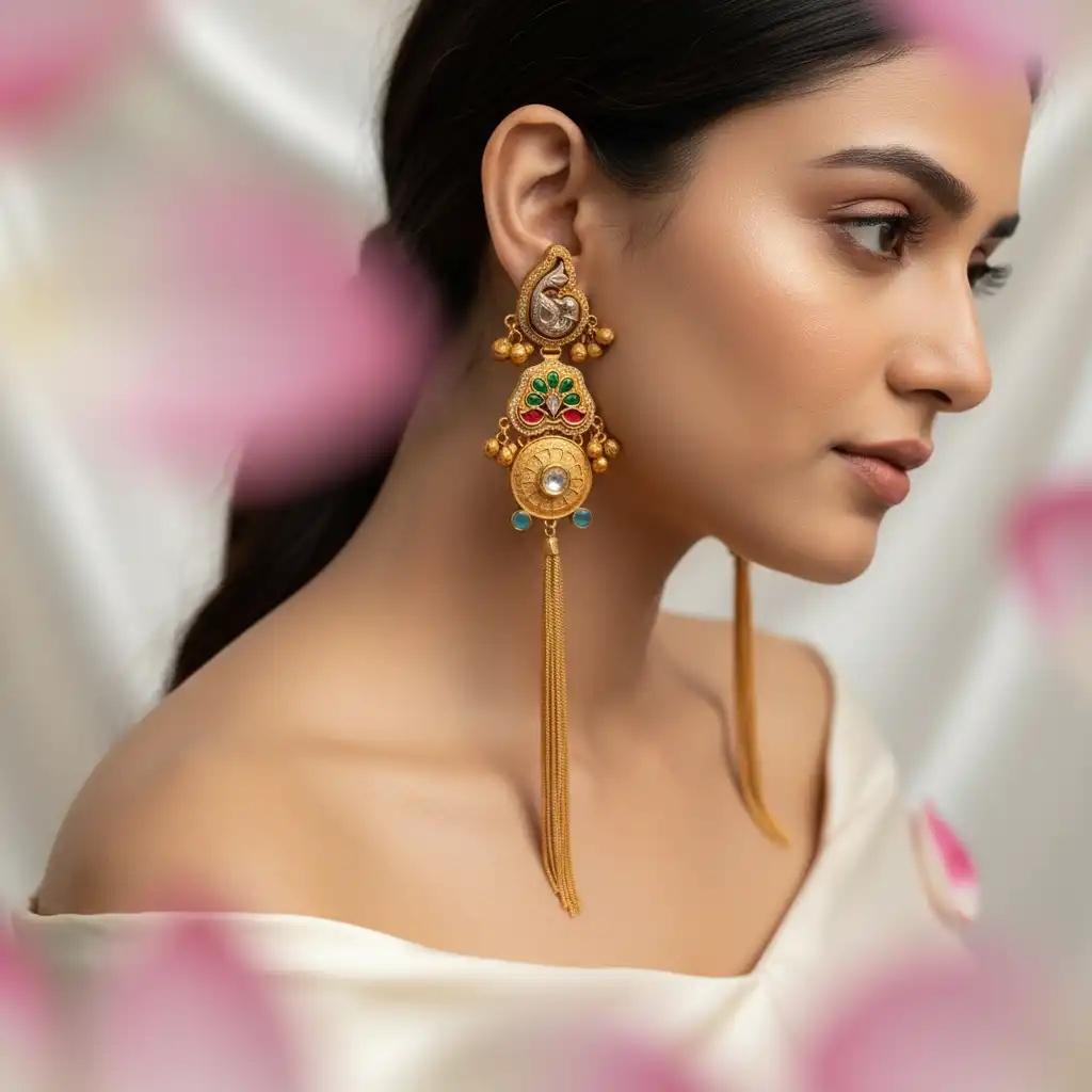 Elegant drop earrings blending traditional motifs with vibrant stones, finished with a sleek golden tassel for graceful movement.