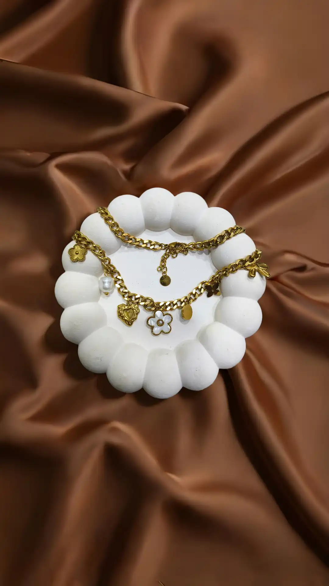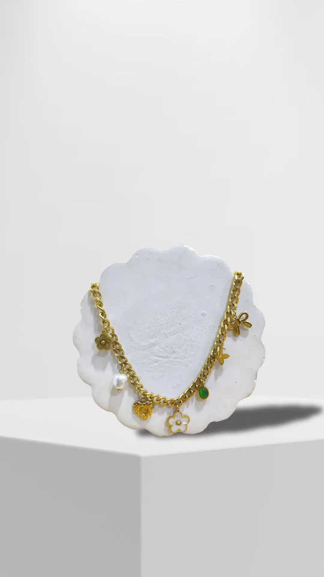 A playful gold-tone chain bursting with quirky charms from hearts and florals to pearls and pops of color. It’s messy, magical, and full of personality just like sweet chaos itself!