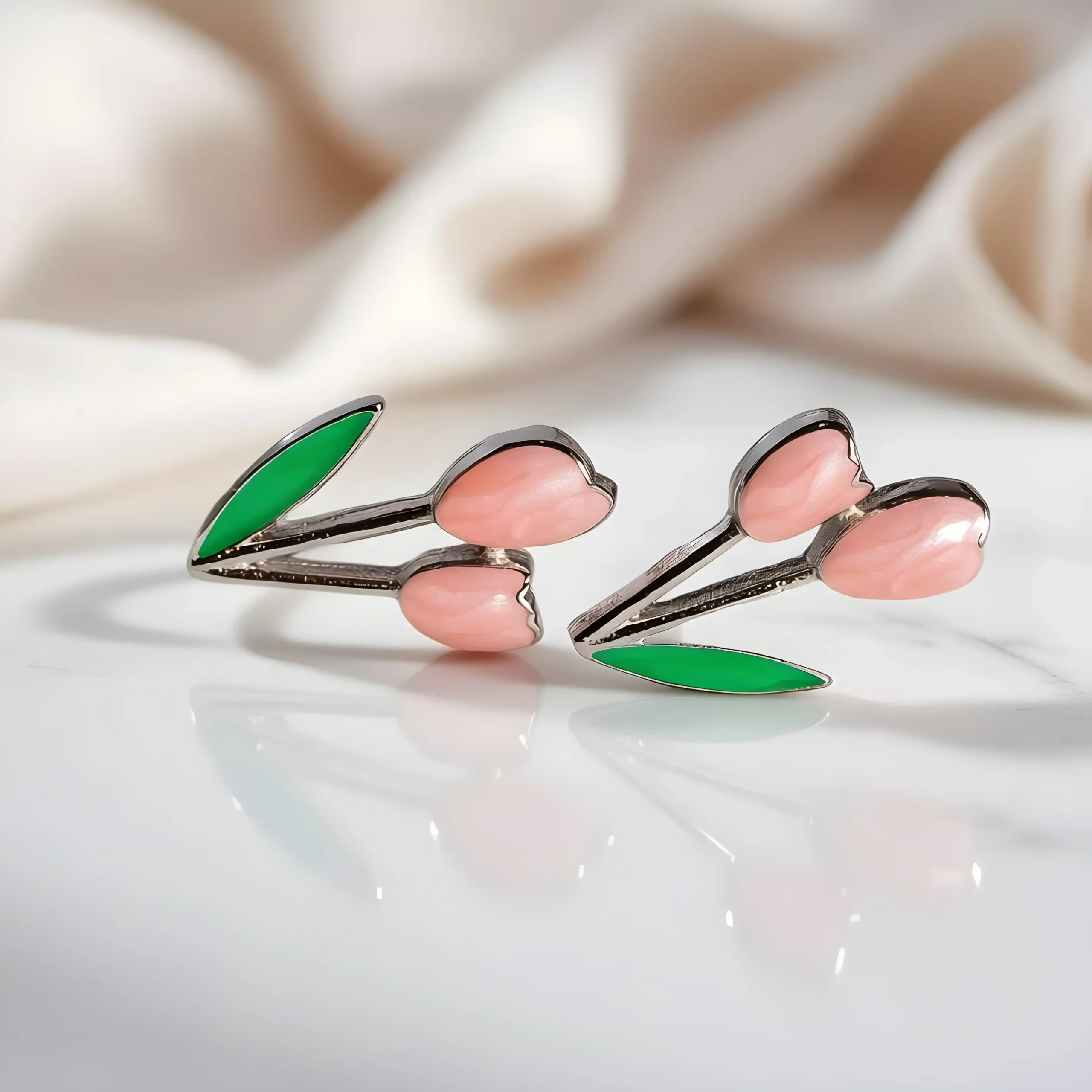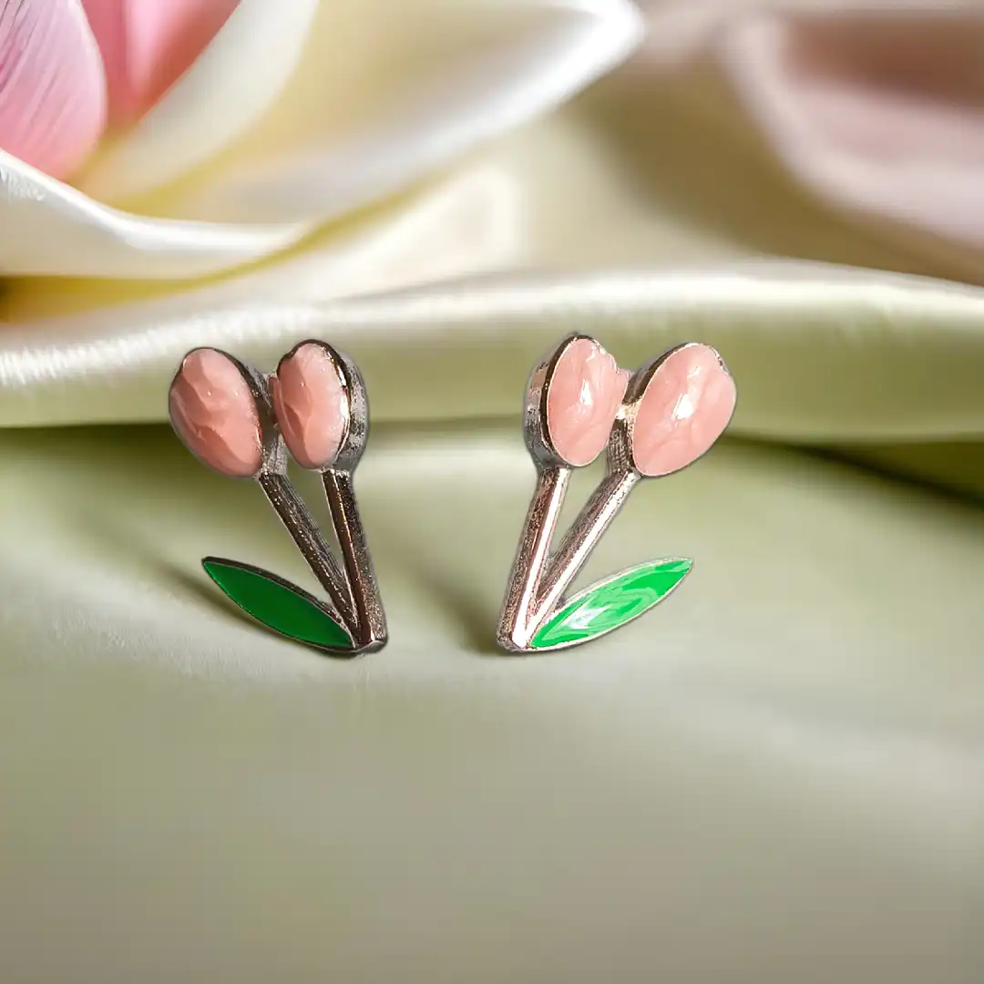These sweet tulip studs feature soft pink petals and vibrant green enamel leaves. A playful addition to any look. Lightweight and charming, they add just the right pop of color.