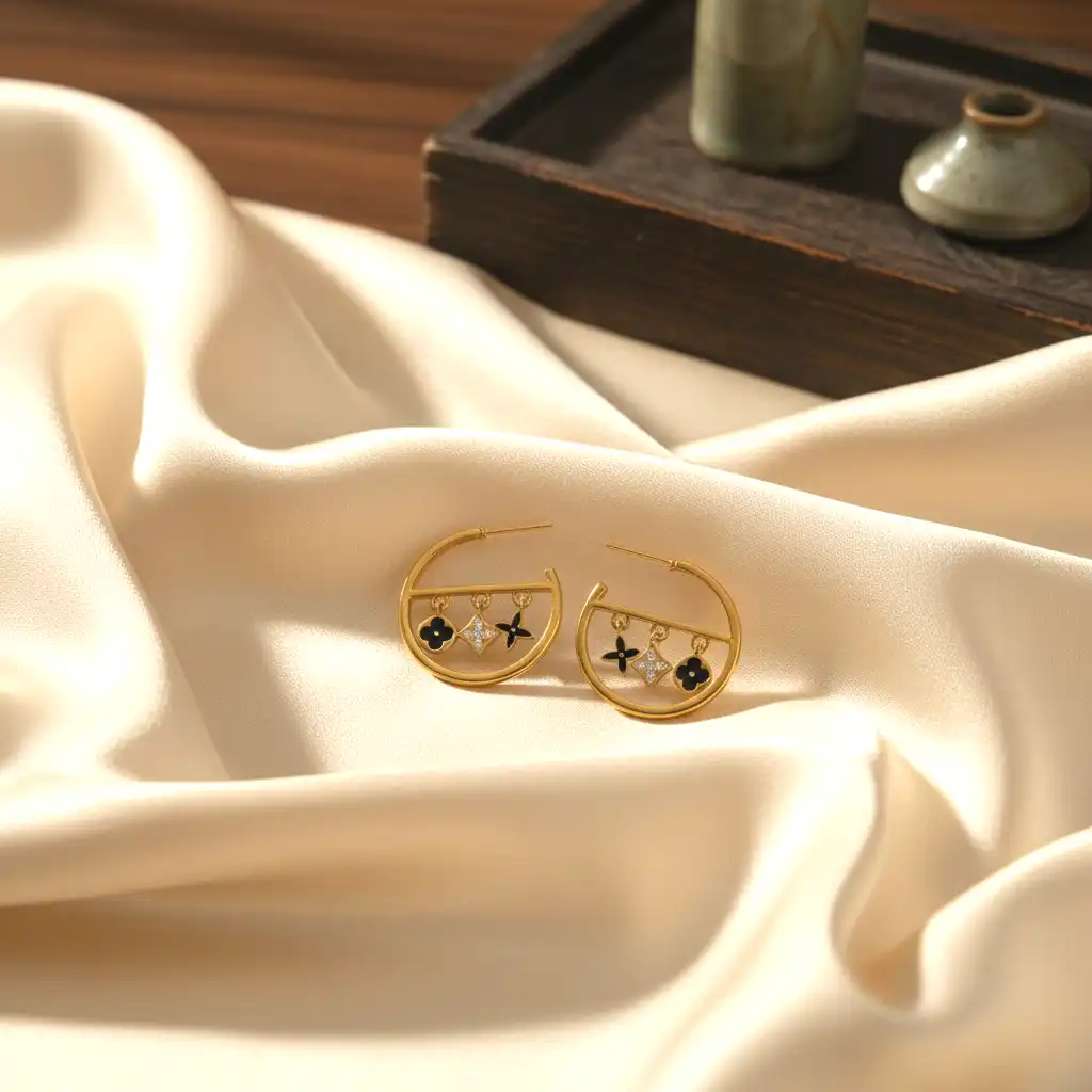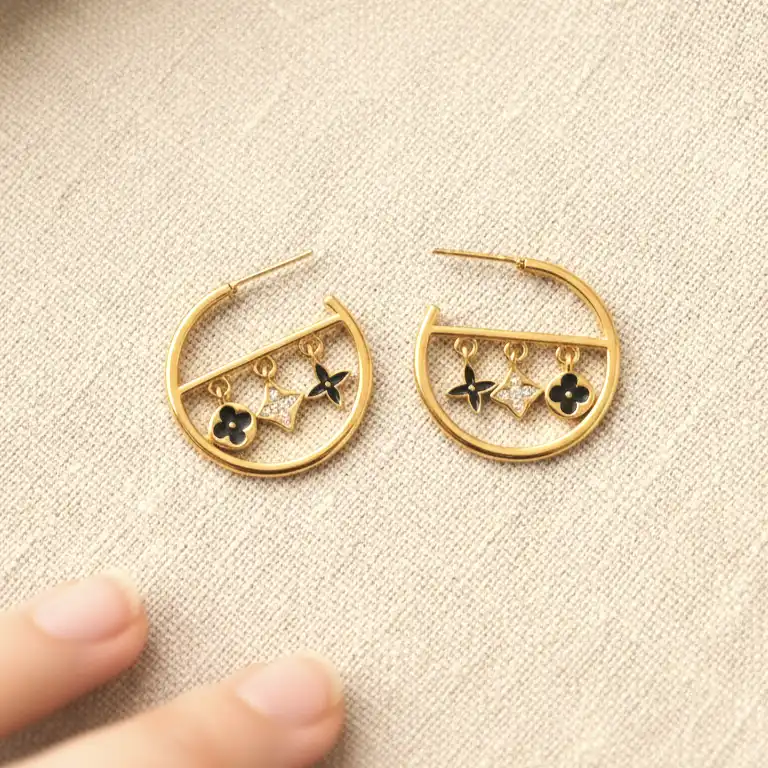 Material & Color: Crafted from premium quality brass with high-quality 18K gold plating, these earrings feature a rich, glossy gold finish. The charms are detailed with black enamel accents and clear cubic zirconia stones, offering a beautiful contrast of deep black, sparkling crystal, and warm gold tones.