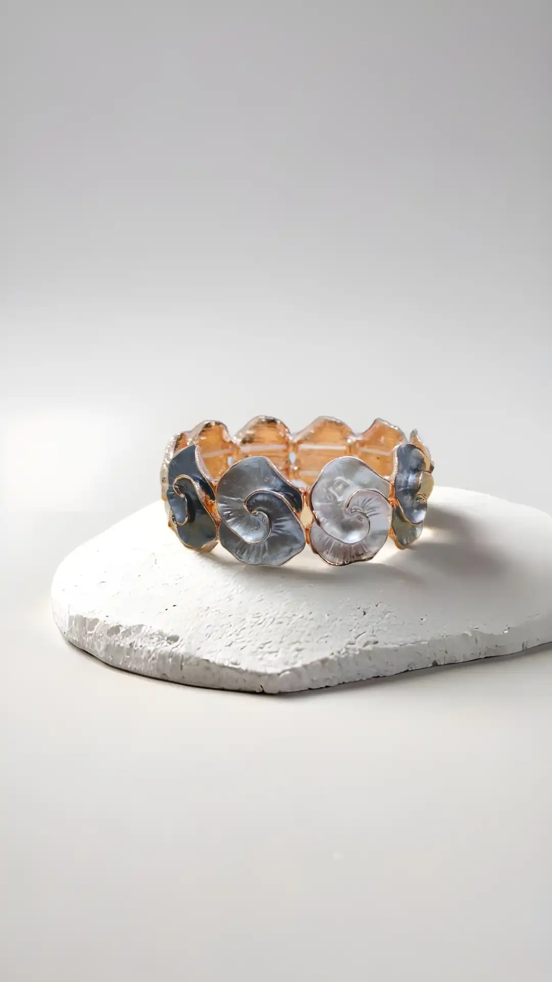 Color: Rose gold base with pearly white and smoky grey floral tones.
