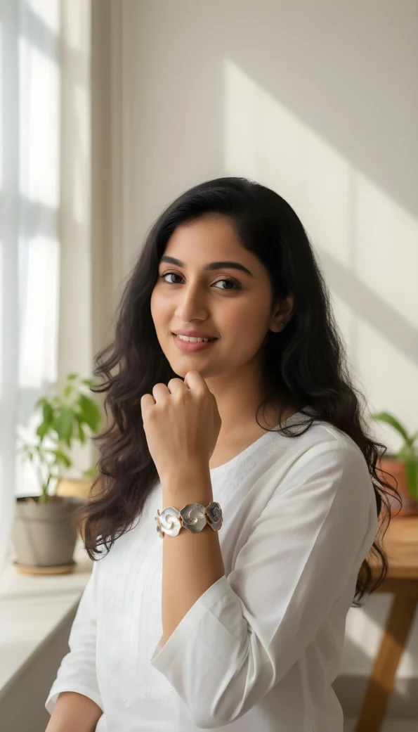 Style it with long sleeves or off-shoulder dresses for that elegant contrast. Pair with pearl or rose gold earrings for a soft, romantic look. Ideal for festive evenings, brunch dates, or wedding celebrations. Complements both ethnic and western outfits — from sarees to satin gowns.