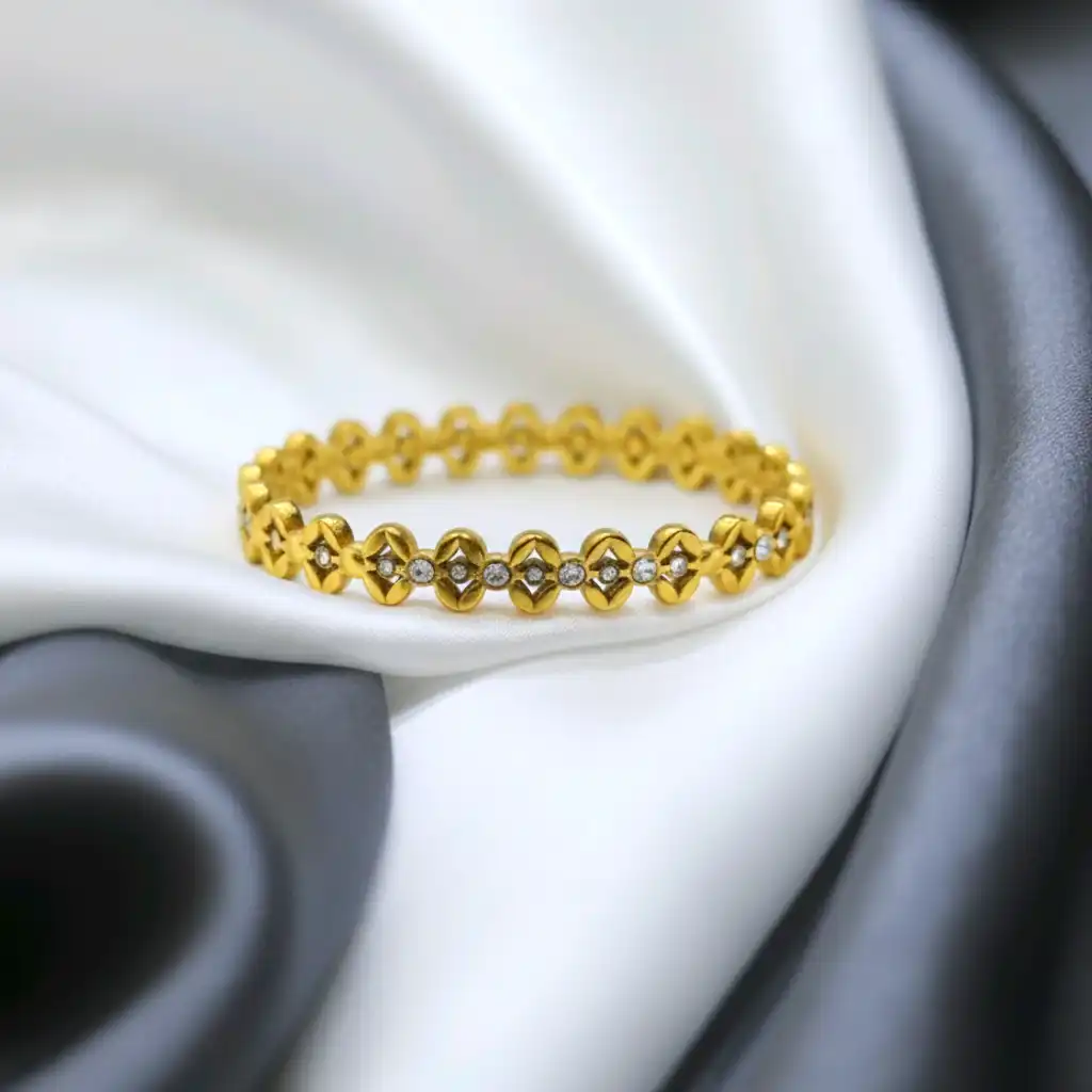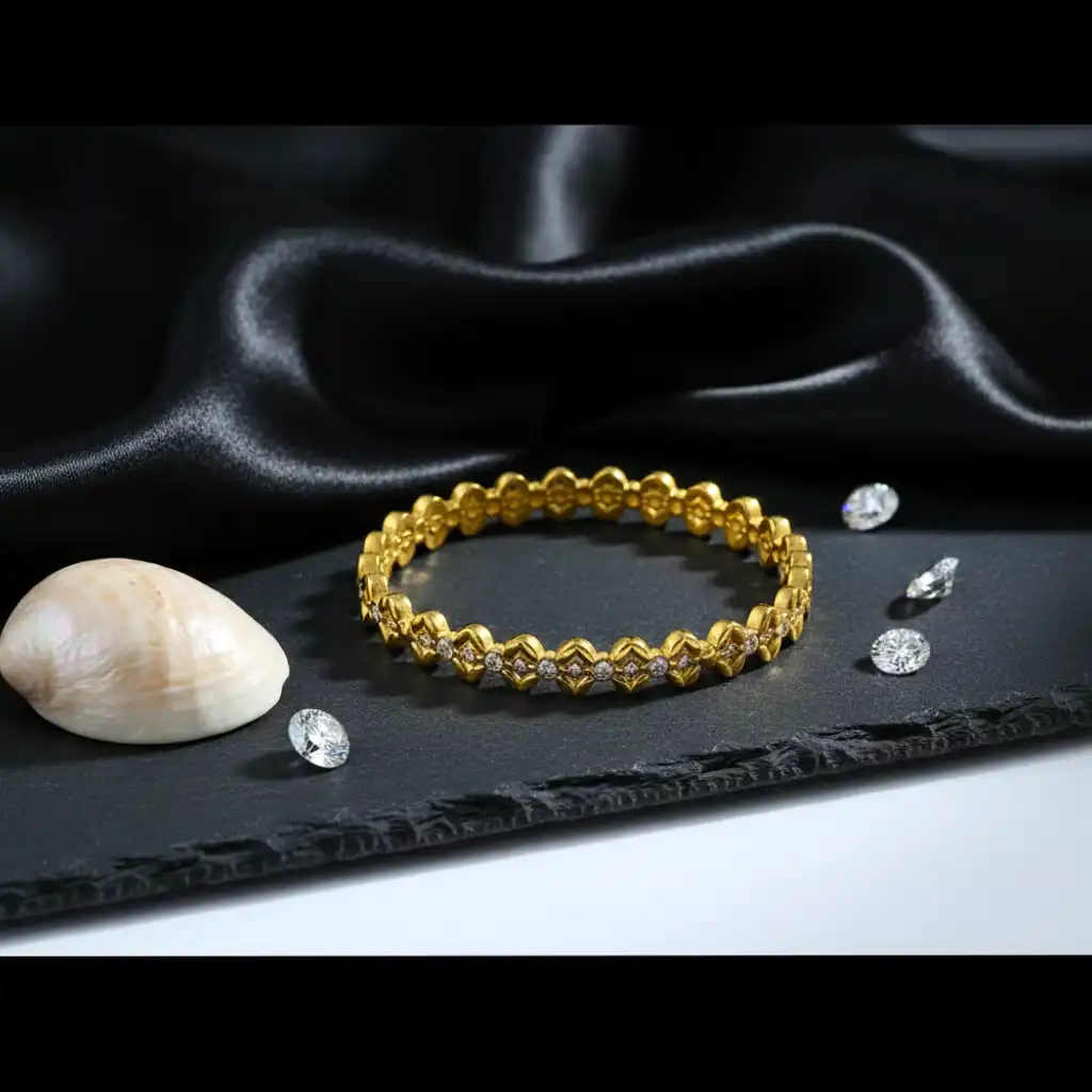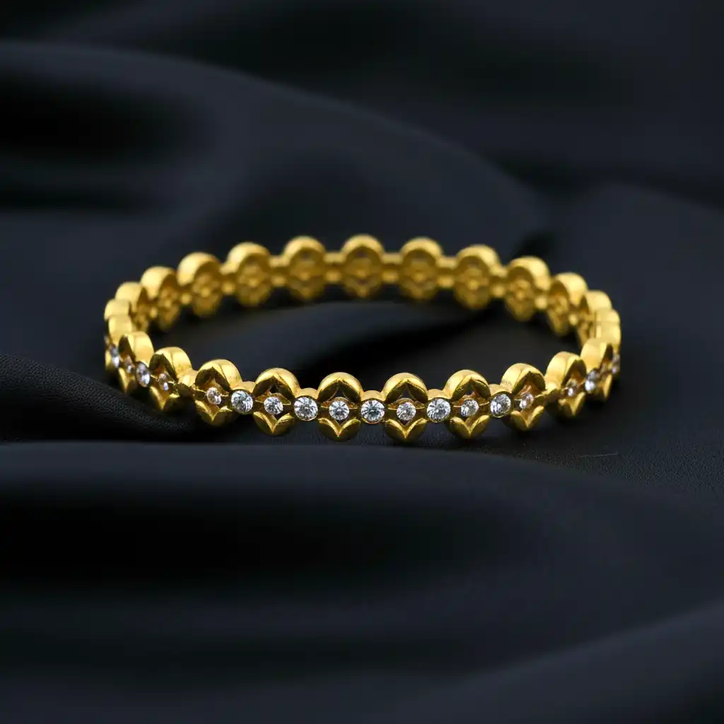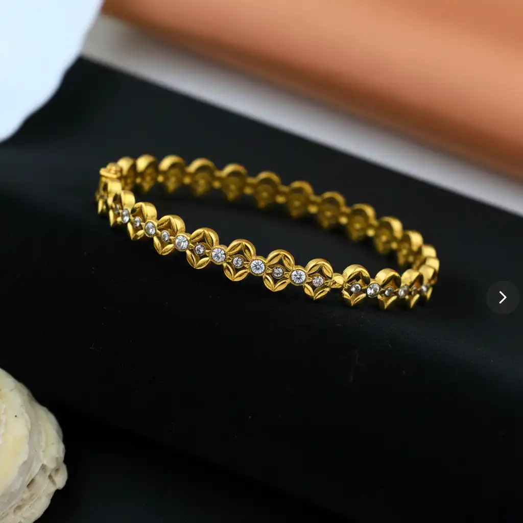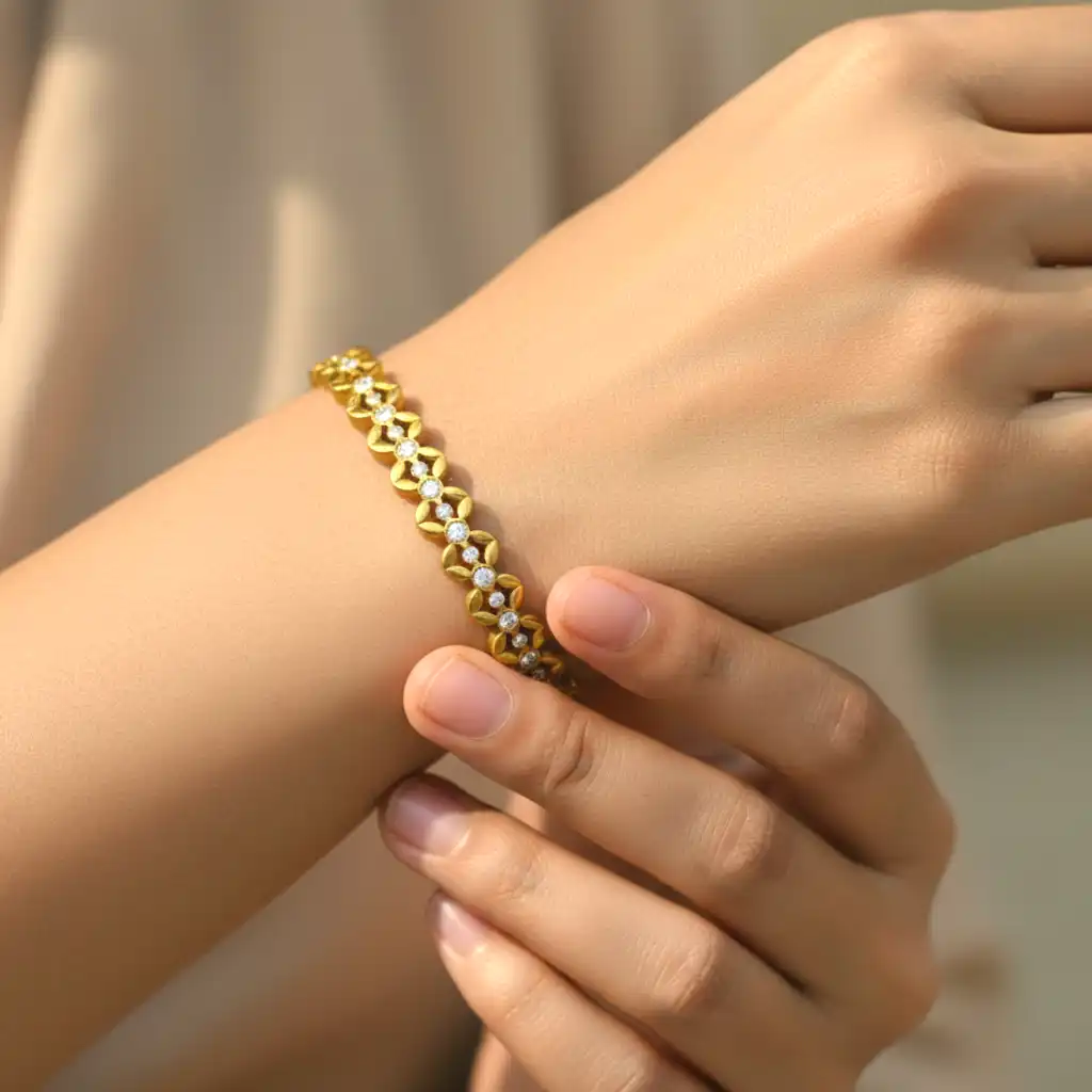 An intricately crafted bracelet inspired by floral patterns, featuring detailed motifs adorned with shimmering zircon stones. The design reflects elegance and royalty, making it ideal for festive occasions and celebrations. Each detail adds depth and brilliance, giving it a premium handcrafted feel.